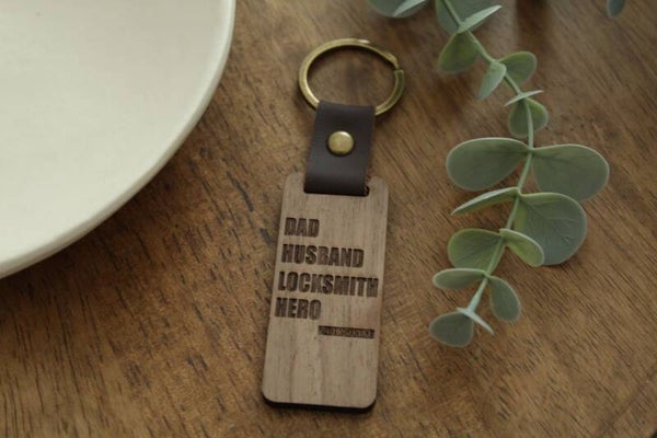 Laser engraved on natural walnut wood with a soft leather strap and brass keyring.