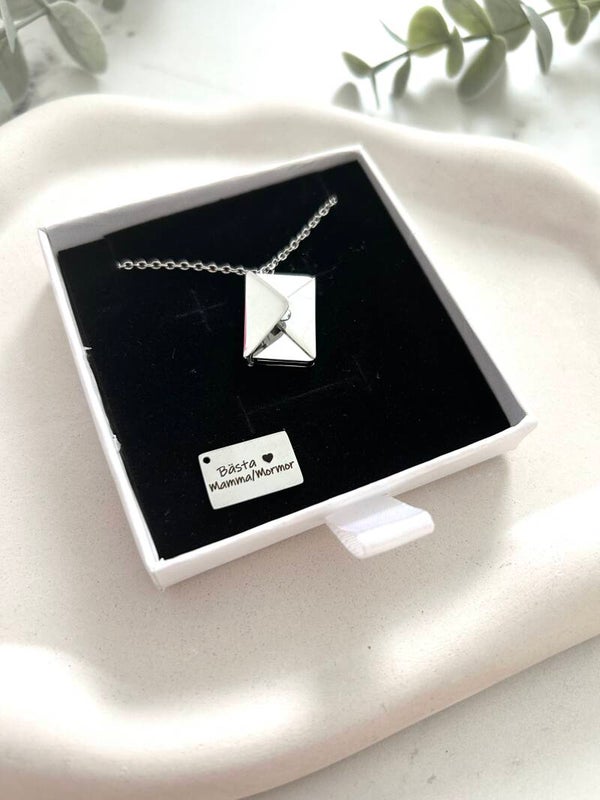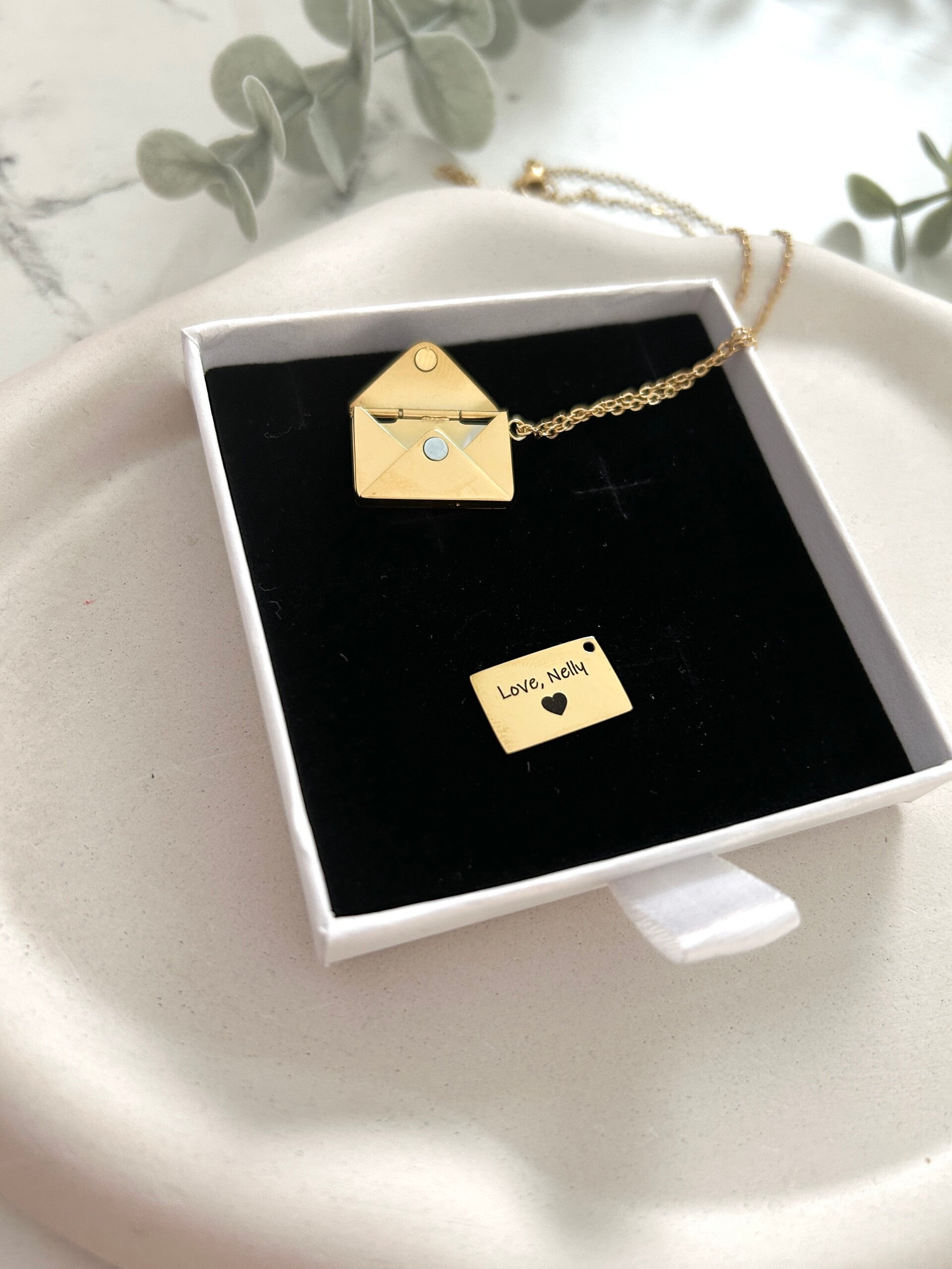 This Secret Message Necklace features a small envelope pendant that opens to reveal a tiny engraved plate inside. Personalize it with a name, date, a short phrase, initials, or a message straight from your heart.