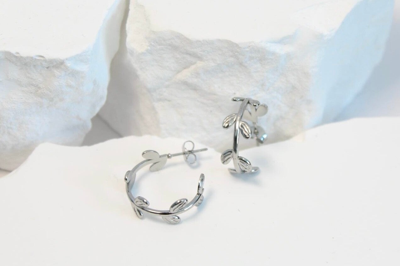 Leaf Hoop Earrings • Silver Stainless Steel