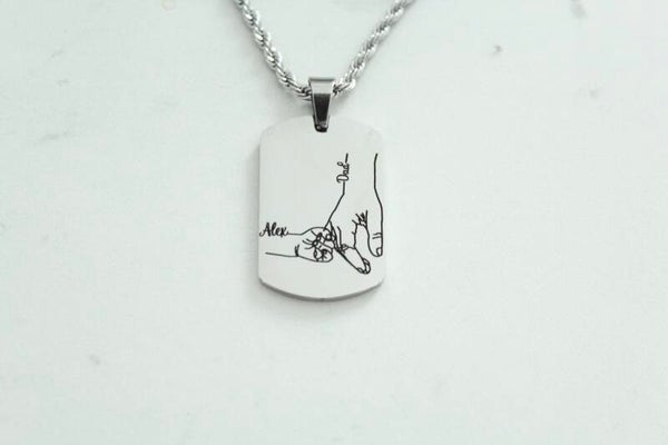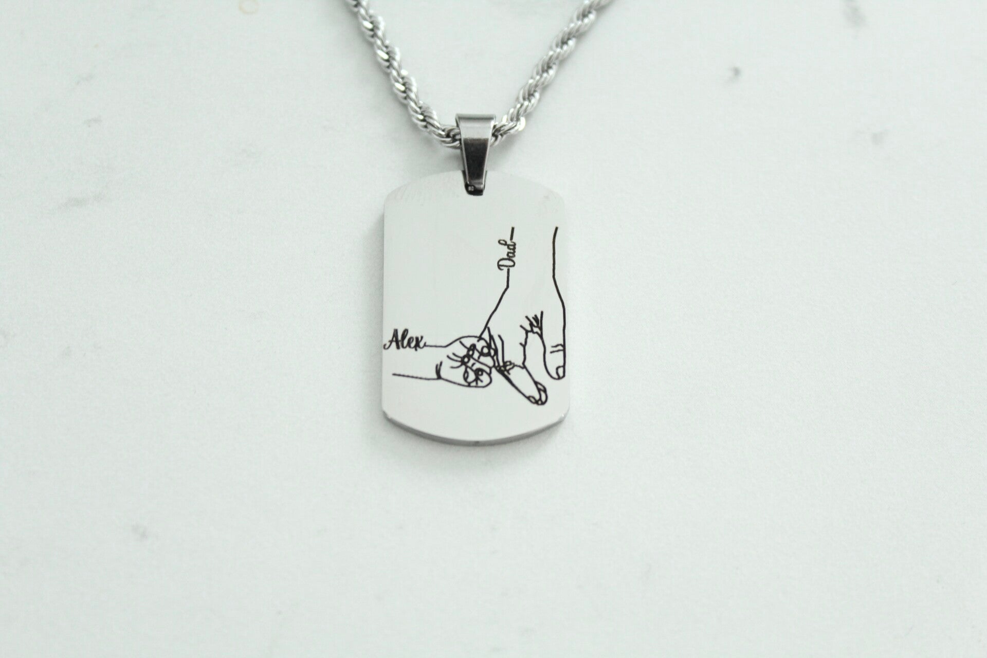 This dog tag necklace is customized with a single-line drawing of a father and child holding hands.