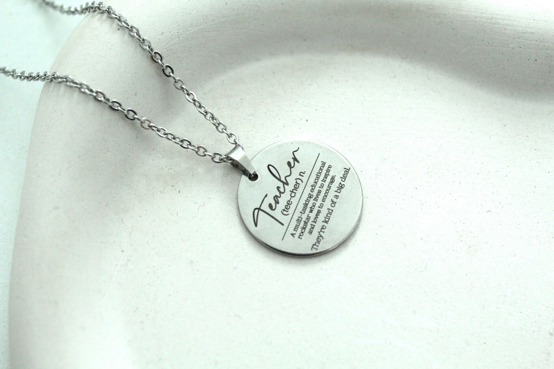 A meaningful gift for the teacher who makes a difference every day. This stainless steel round pendant features a beautiful minimalist engraved definition of “Teacher” — celebrating their guidance, patience, and dedication. A thoughtful end-of-year gift, graduation gift, or holiday thank-you your teacher will keep close to heart.
