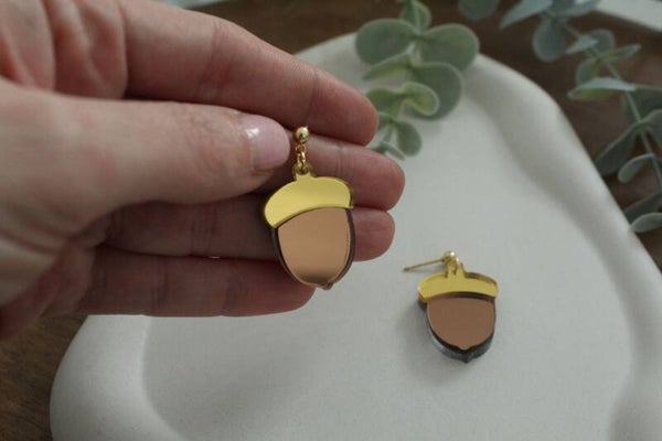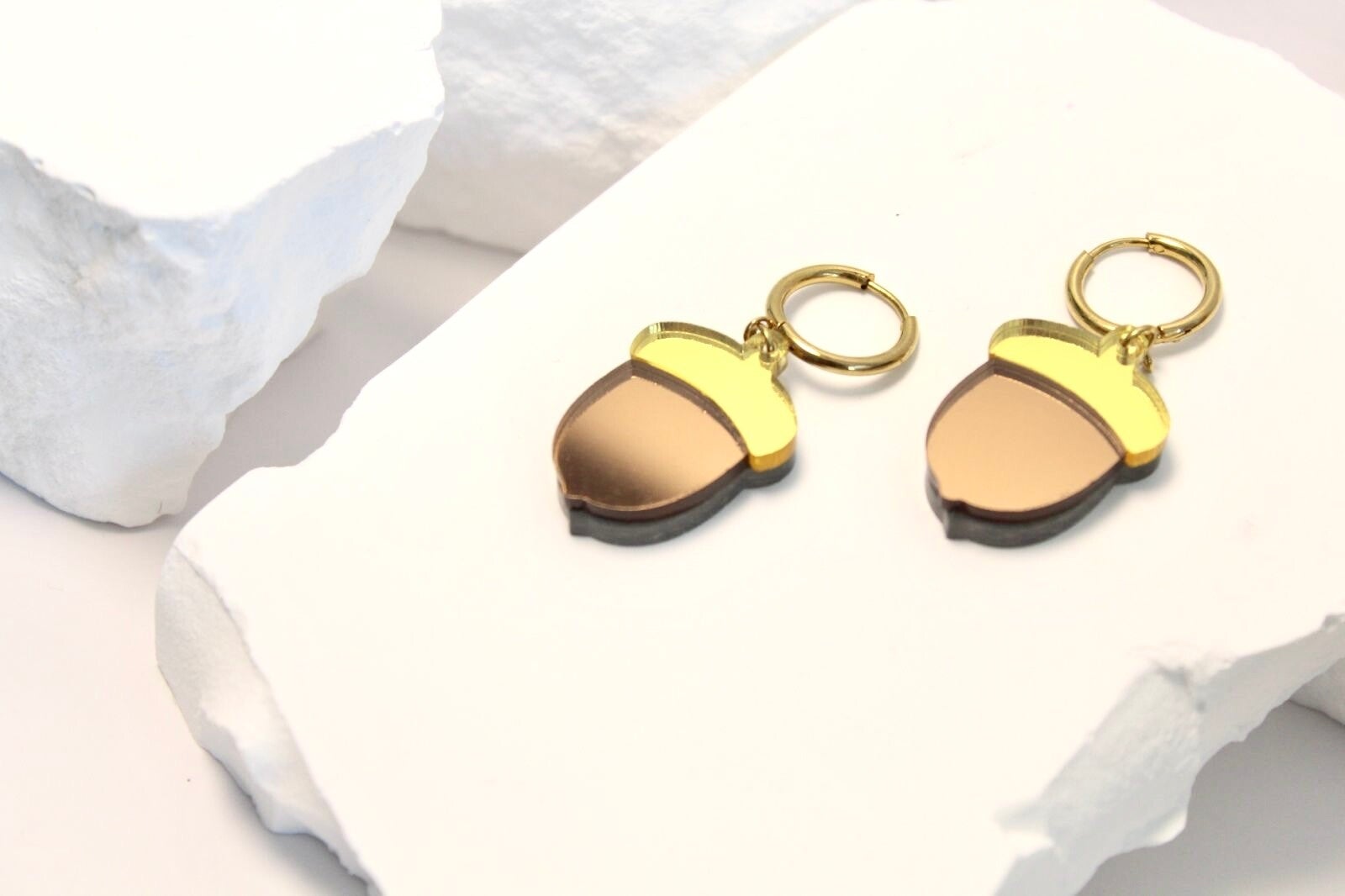 These Acorn Earrings are crafted from reflective mirror acrylic in warm toffee + gold tones, paired with gold-tone hoops for a soft autumn glow.
