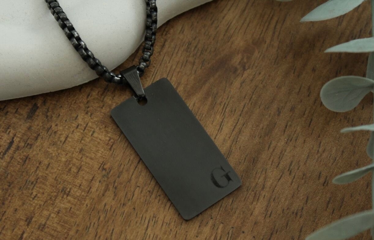 A sleek black stainless steel tag necklace with a clean engraved initial.