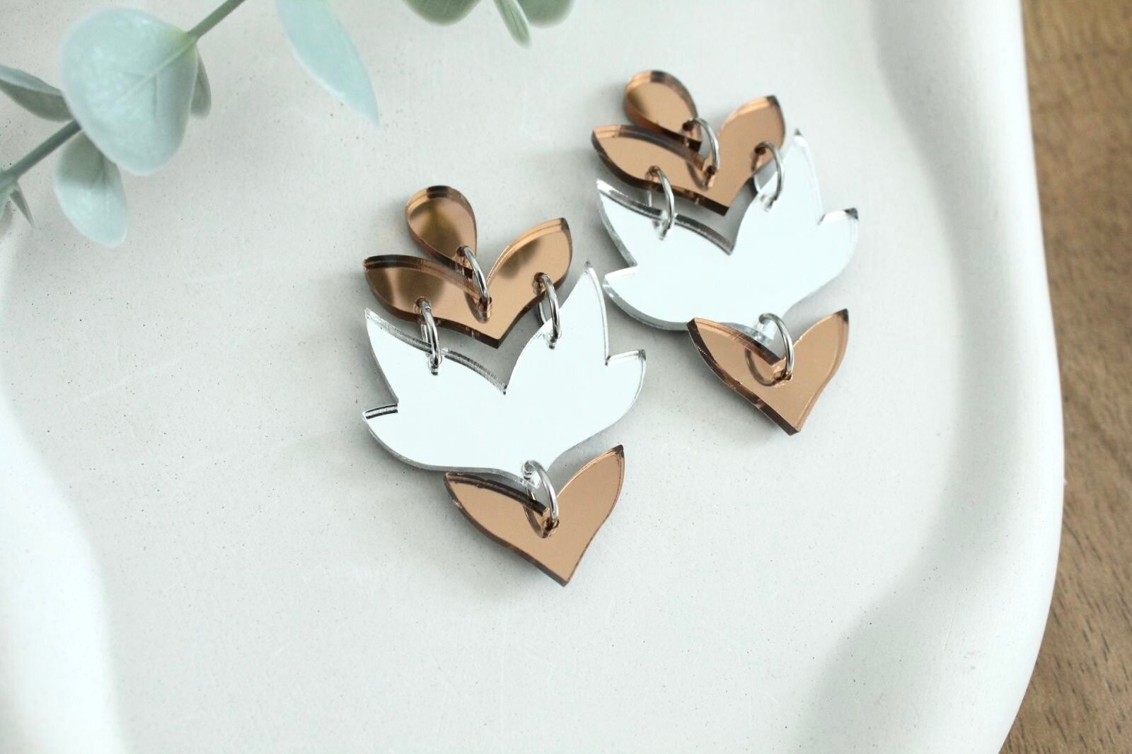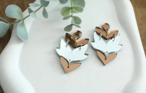 Elegant layered earrings crafted from silver and bronze mirror acrylic. Lightweight, modern, and eye-catching for everyday wear or special occasions.