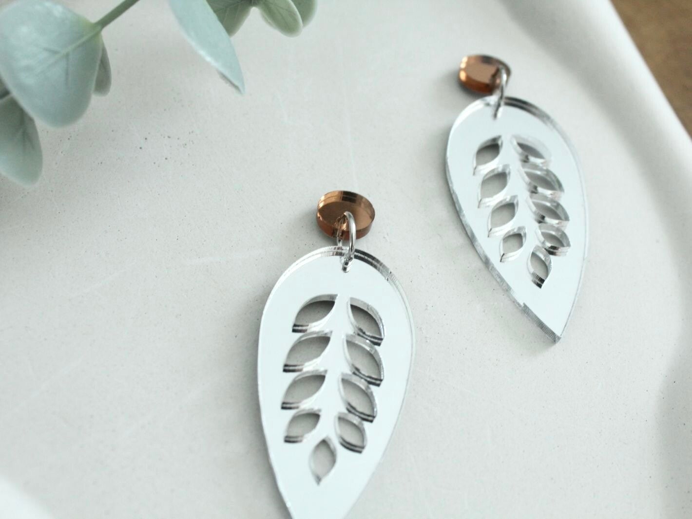 Elegant leaf-shaped earrings crafted from high-gloss mirror acrylic in silver, paired with a small bronze top accent.